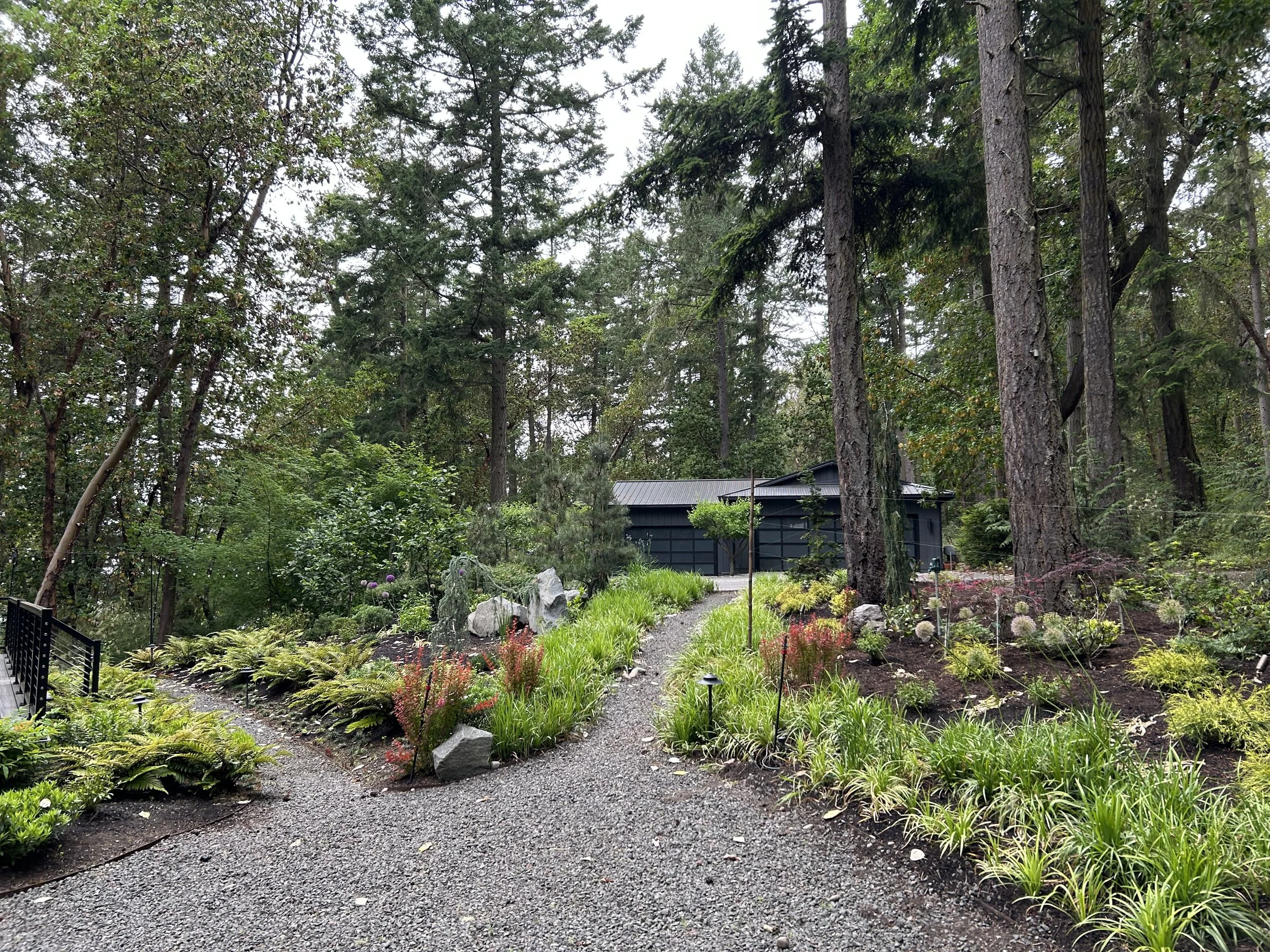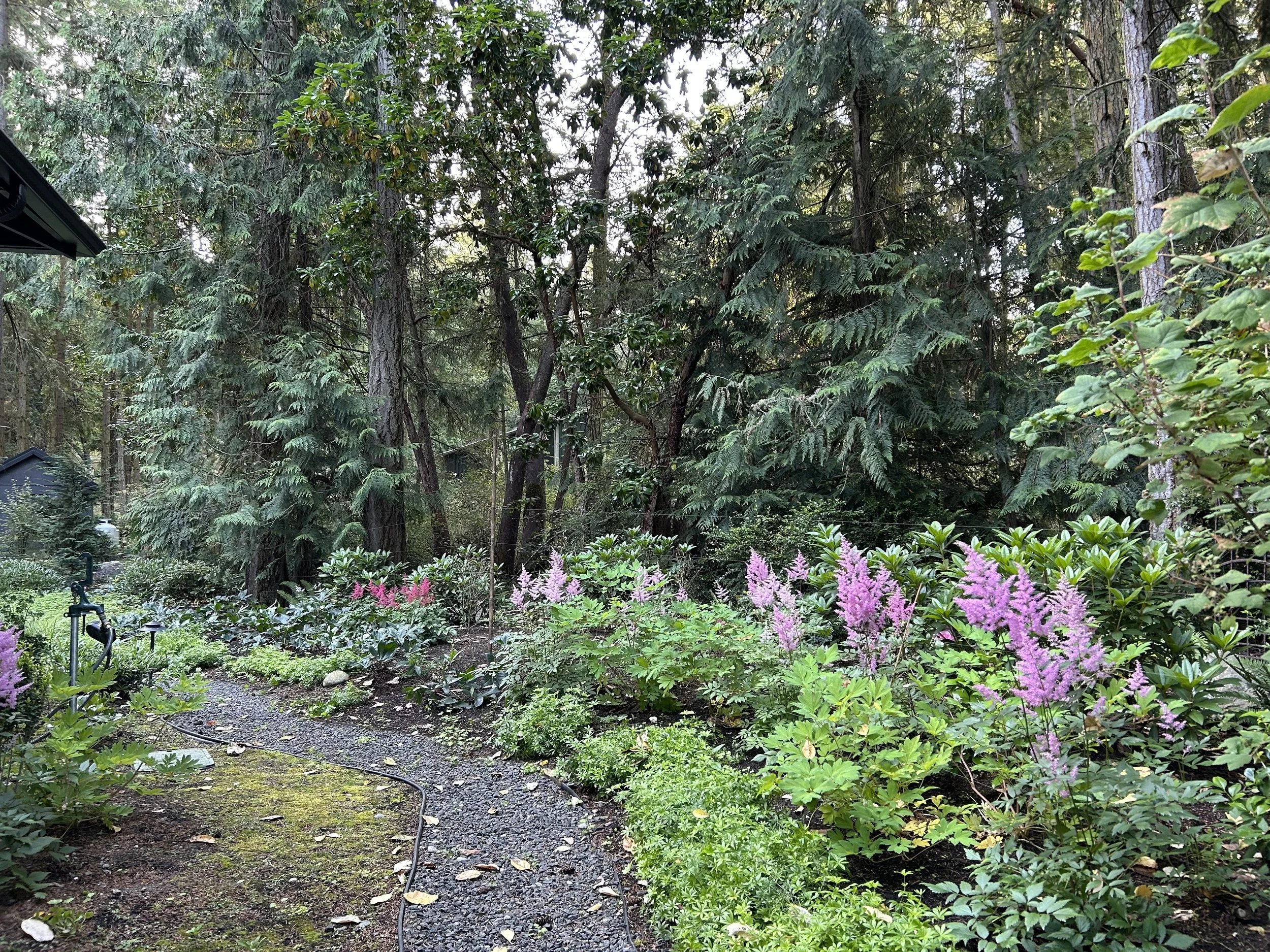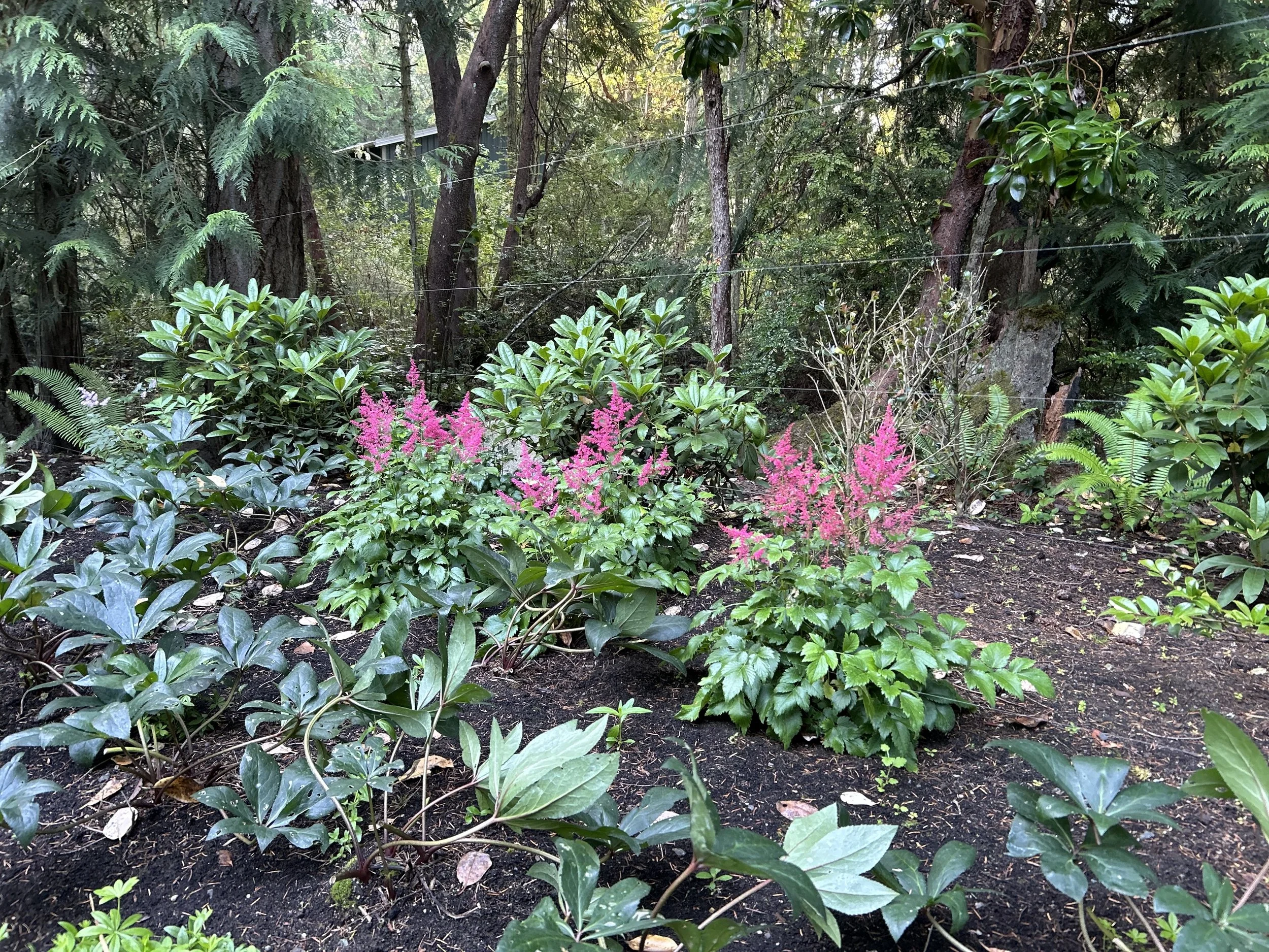 Camellia rescue garden Oct. 2024 After deer ate them down to the nubs late summer, we designed fencing with fishing line and bamboo poles and have placed all the eaten camellias in two protected areas. This one faces NE from the teahouse deck.